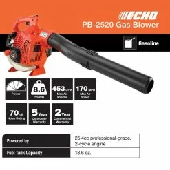 The top performing ECHO PB-2520 gas leaf blower is the lightest, fully featured handheld blower. The professional grade 25.4 cc engine produces 453 CFM and 170 MPH for a quick and easy clean up. The lawn blowers unique S-Pipe design reduces the gyro effect on user’s wrist improving user comfort. This yard blower also offers variable cruise control to allow its operator to adjust while completing the job.