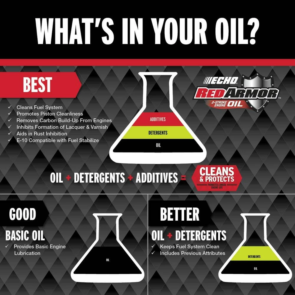 Red Armor 16 oz. oil is the perfect partner to add to 6 Gal. of fuel to help protect your 2 cycle engine from carbon build-up while cleaning existing deposits. By using powerful detergents to remove performance robbing carbon deposits, Red Armor Oil, does so without sacrificing lubrication or film strength. Mixing Red Armor oil in combination with regular fuel helps to properly lubricate engine components, helping to extend the life of the engine and product.