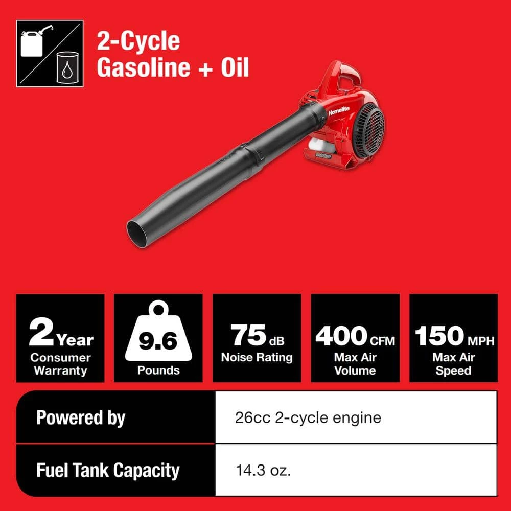 You have a lot of choices to make when you’re looking for a good gas blower. Homelite makes the decision a little easier with the Homelite 2-Cycle Gas Blower: a perfect combination of value and performance. The powerful 26cc engine delivers speed up to 150 MPH/400 CFM and the quick-fire starting system lets you get the engine started fast with fewer pulls. This gas blower weighs less than 10 lbs. so you can enjoy the benefits of gas power with less fatigue. Also featuring an easy-to-use variable speed throttle at the handle, air speed is completely under your control. All backed by a 2-year warranty, the Homelite 2-Cycle gas blower is ready to take on the season.