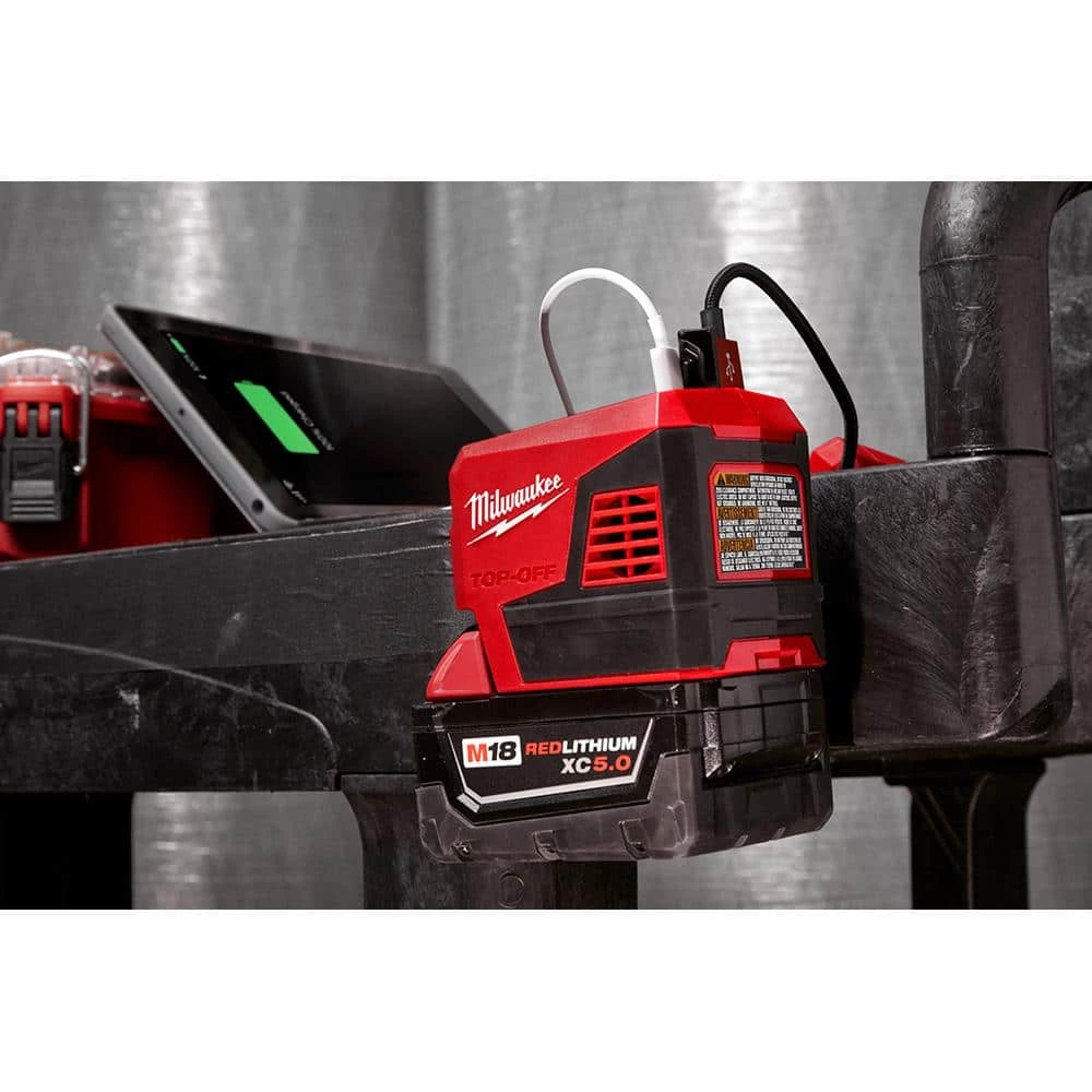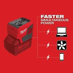 Our M18 TOP-OFF 175-Watt Power Supply delivers faster simultaneous power to personal devices and small electronics. Attach any M18 battery to provide continuous power or recharge devices with 1 AC 120-Volt outlet, 1 USB-C PD port, and 1 USB-A port. You can quickly charge up to 3 devices at the same time, without the barriers of speed throttling. With the USB-C PD port (45-Watt), this battery inverter is capable of recharging devices, from a fully depleted state to 80% capacity, up to 75% faster than conventional wall chargers (5-Watt). The Milwaukee compact portable power supply has an attached metal rafter hook that can be extended to hang it from carts, lumber, or other jobsite materials when worksurface space is limited. You can instantly set up a mobile workstation or keep electronics securely within eyeshot, rather than making frequent trips to a wall outlet. Plus M18 5.0 Ah battery.