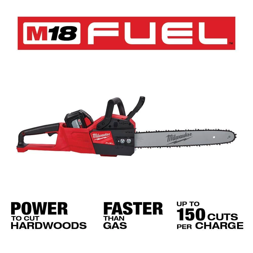 The Milwaukee M18 FUEL 16 in. cordless chainsaw delivers the power to cut hardwoods, cuts faster than gas-powered models and delivers up to 150 cuts per charge. The battery powered chainsaw is designed to meet the performance, durability and ergonomic needs of professional landscape maintenance, power utility and the installed M18 users. M18 FUEL technology allows the unit to reach full throttle in under 1 second providing the ultimate control and productivity. The POWERSTATE Brushless Motor was purposely built for the M18 FUEL 16 in. Chainsaw to provide the power and performance of a gas engine up to 40CC. Built-in REDLINK PLUS Intelligence ensures optimal tool performance and provides overload protection to prevent damage to the tool and battery during heavy applications while still maintaining compatibility across the entire M18 System. The REDLITHIUM high output HD12.0 battery pack provides 50% more power and runs 50% cooler versus standard REDLITHIUM HD packs. Superior pack construction provides the industry’s best protection against jobsite weather and environmental conditions. In addition to the chainsaw, this kit comes with one M18 REDLITHIUM High Output HD12.0 battery pack (48-11-1812), 1 M18/M12 multi-volt rapid charger (48-59-1808), one 16 in. oregon bar and chain and 1 scrench. Includes a extra 16 in. chainsaw Chain (49-16-2715).