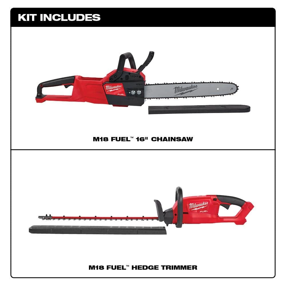 - Includes: one 2727-20 M18 FUEL 16 in. chainsaw, one 16 in. Oregon bar and chain, 1 scrench, one 2726-20 M18 FUEL hedge trimmer
