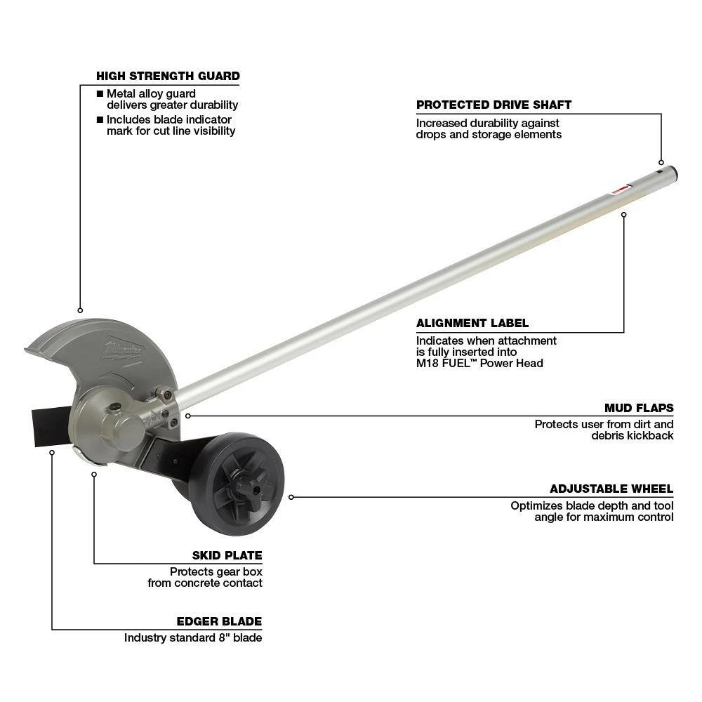 The Milwaukee M18 FUEL QUIK-LOK 10 in. Pole Saw Attachment is powered by the M18 FUEL Power Head and with QUIK-LOK is compatible with the QUIK-LOK Attachment System. The unit features a 10 in. Oregon bar and chain which provides users with smooth and fast cuts with minimal kickback. The pole saw attachment includes an automatic oiler for proper chain lubrication, easy access chain tensioner for quick adjustments to chain tension and a branch hook for added cutting leverage and branch removal. The QUIK-LOK Attachments feature protected drive shafts for increased durability against drops and storage elements. The pole saw attachment also utilizes optimized gearing to manage the cordless M18 FUEL Power Head RPM output specifically for cutting applications. The Milwaukee M18 FUEL QUIK-LOK Edger Attachment is powered by the M18 FUEL Power Head with QUIK-LOK and is compatible with the QUIK-LOK Attachment System. The unit features an 8 in. blade and high strength guard for increased durability. The edger includes mud flaps to prevent dirt kickback, as well as a skid plate to protect the gearbox from concrete contact. The adjustable wheel allows users to set an optimized blade depth and tool angle for maximum control. The edger attachment also utilizes optimized gearing to manage the cordless M18 FUEL Power Head RPM output specifically for edging applications.