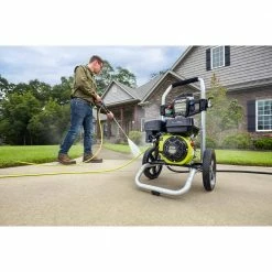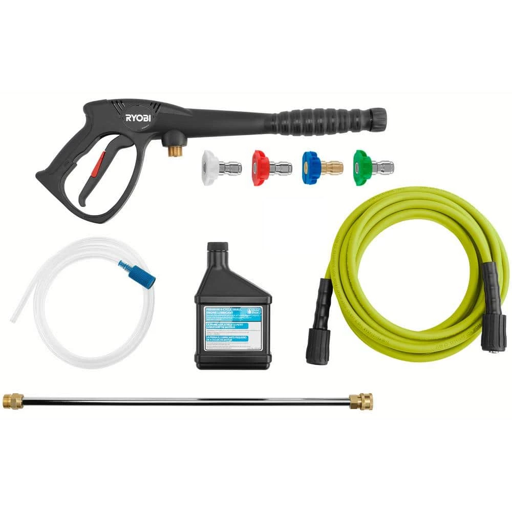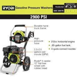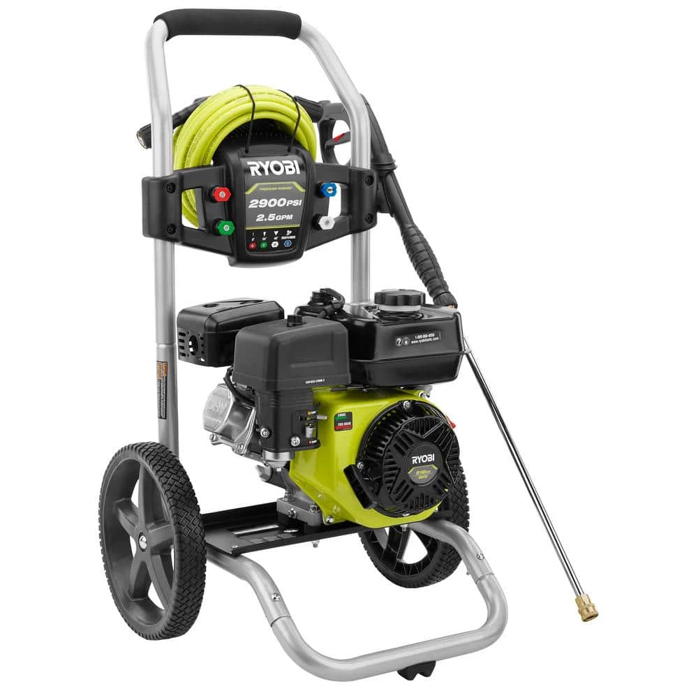 The RYOBI 2900 psi Pressure Washer is engineered to handle even your toughest jobs. The powerful 212 cc horizontal engine delivers 2900 psi for cleaning driveways, decks, windows and other areas around the house. The large capacity fuel tank provides longer runtime so you don’t have to stop to refuel before completing a long job. Featuring a durable, hand truck frame design and large 12 in. flat-free wheels this pressure washer is designed for easy transport. Easily access hard to reach areas with the included 25 ft. non-marring high pressure hose. This pressure washer includes 4 quick-connect nozzles (0 degree , 25 degree , 40 degree and Soap) for added versatility. The on-board accessory storage is a convenient feature that allows you to store the nozzles once the job is complete. The RYOBI 2900 psi Gas Pressure Washer is backed by the RYOBI 3-year limited warranty.