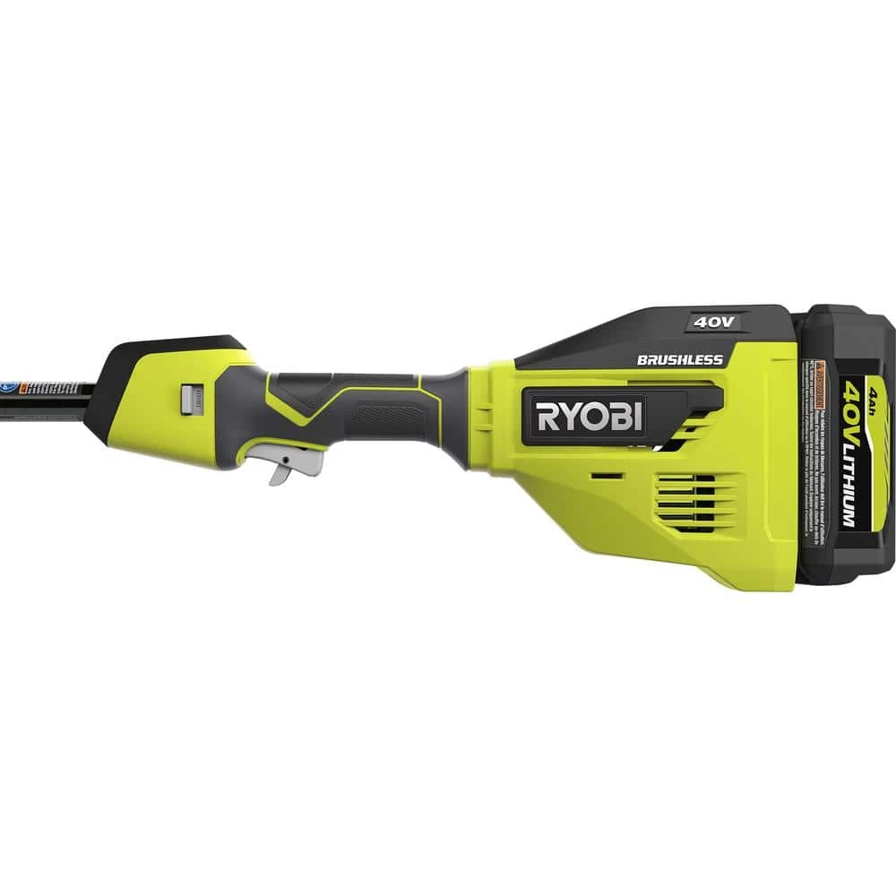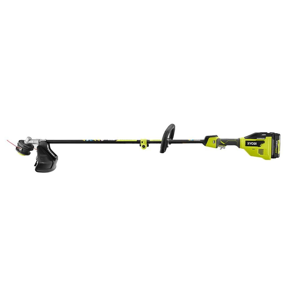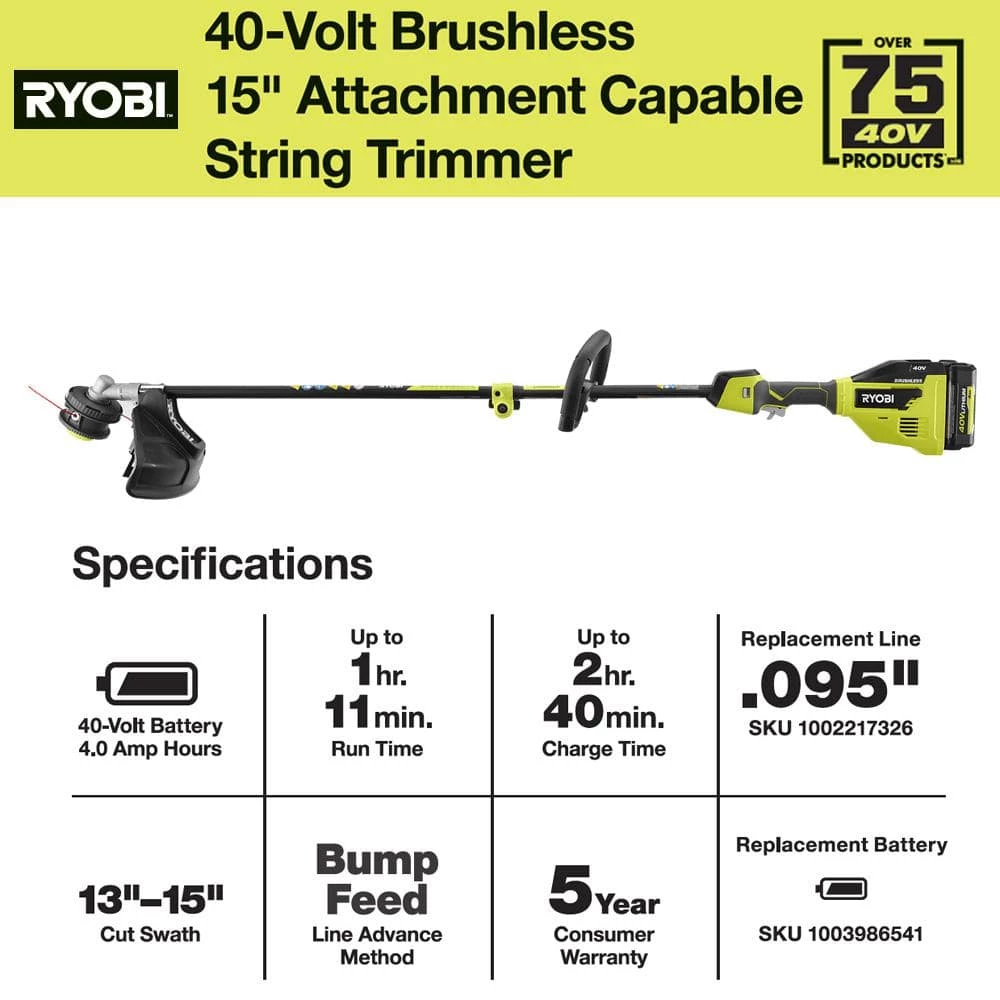 The RYOBI 40V Brushless String Trimmer gives you the cordless convenience you want with the GAS-LIKE POWER you need. The EXPAND-IT attachment capability allows you to transform your trimmer into an edger, blower, pole saw and many more tools with the available attachments, meaning you can save time, space and money. This RYOBI trimmer has a brushless motor for maximum power and durability. This unit is equipped with the REEL EASY plus 3-in-1 Bump Feed Head with SPEED WINDER, which can be reloaded in 60-seconds or less. This REEL EASY plus head can function as a bump feed head, fixed line head or bladed head. The variable speed trigger and 2-speed switch deliver increased control for any application. The adjustable 13 in. to 15 in. cut swath allows you to optimize your trimmer for increased run time or increased productivity. This lightweight and well-balanced design also has an adjustable front handle for user comfort and is backed by a 5-year warranty. The trimmer is equipped with a 4.0 Ah battery and charger that are compatible with over 75 RYOBI tools on the RYOBI 40V system.