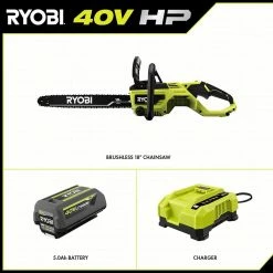 The RYOBI 18 in. 40V HP Chainsaw is the perfect combination of power and convenience. This chainsaw has all the power and length of a gas chainsaw with less maintenance. The combination of a 40V 5.0 Ah battery and Brushless Motor deliver the fast cutting speed and torque you would expect from a gas model. This chainsaw features an adjustable automatic oiler, side access chain tensioning, and on-board tool storage for the most convenient operation and easy adjustments. The mechanical chain brake is a safety feature on the chainsaw that helps prevent kickback. When the job is complete, store the chainsaw in the durable chainsaw carrying case for easy transportation and storage. The included 40V rapid charger, charges your RYOBI 40V batteries 4X faster than the standard charger. The RYOBI 18 in. 40V HP Chainsaw, batteries, and rapid charger are all compatible with 75+ RYOBI 40V products. This tool is backed by a 5-Year Tool Warranty.