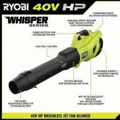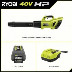 This 40V HP Brushless WHISPER SERIES Blower delivers incredible power without the noise! Delivering 650 CFM and 160 MPH this blower can tackle wet and dry leaves. It is a part of our WHISPER SERIES of products and is 85% quieter than a gas blower. Giving you all the power without the noise. This blower is loaded with premium features like a variable speed trigger to blow in more delicate areas, cruise control to reduce fatigue during extended use, a turbo button for maximum power, and a speed tip attachment to increase your air speed for heavier debris. All of these features combine to provide you with ultimate control to meet your needs. This kit is equipped with a 40V 6Ah battery and the a 40V Fast Charger that charges your battery in under 90-minutes with 2X faster charging. The battery is compatible with the RYOBI 40V system. The 40V HP WHISPER SERIES Jet Fan Blower is backed by a 5-year tool warranty.