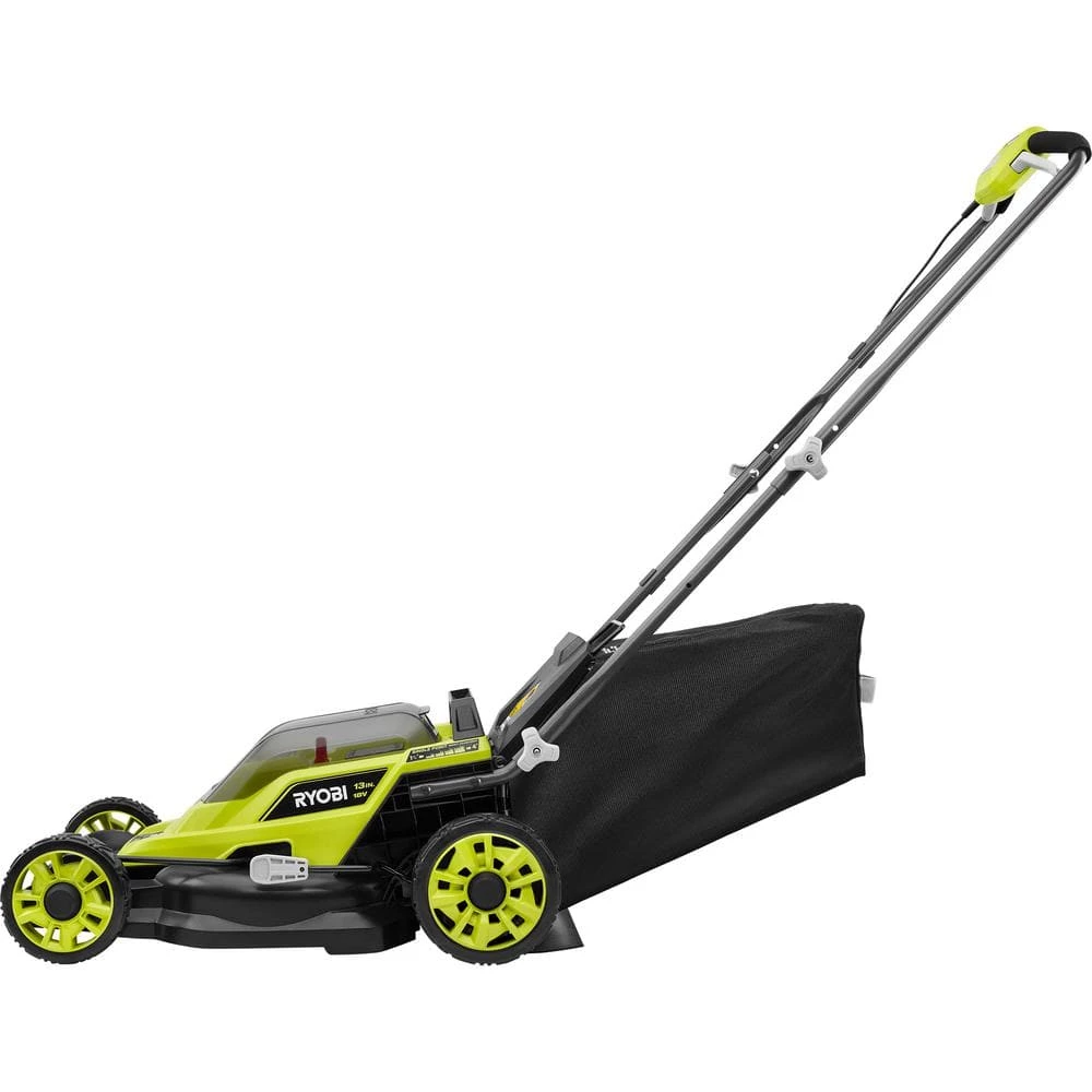 The RYOBI 18V ONE+ Cordless 13″ Mower easily starts with the push of a button and mows up to a ΒΌ acre or up to 30 minutes on a single charge. Simply insert the included battery and you’re ready to mow in seconds without the hassle of gas or oil. This mower features a single point height adjustment, 2-in-1 mulching and bagging functions, and easy lift bag removal. The compact, lightweight design makes it easy to carry from one place to another, and the handles fold for convenient, vertical storage when the job is done. The RYOBI 18V Cordless 13″ Mower includes an 18V ONE+ 4.0 Ah battery and charger and is backed by a 3-year warranty.