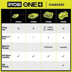Expand your RYOBI 18V ONE+ System with the RYOBI 18V ONE+ 6-Port Fast Charger. With 30% faster charging than P135, this charger decreases downtime significantly. Made with convenience in mind, it can consecutively charge and maintain up to 6 18V ONE+ batteries. This charger includes a 2 Amp USB output allowing users to charge portable electronics. Featuring LED indicator lights, users can easily identify battery charge status. The Energy Save Mode conserves energy when not charging or maintaining batteries. To maximize workspace, the wall mount capability ensures organization at any given point. Best of all, it is part of the RYOBI 18V ONE+ System of over 260 Cordless Products that all work on the same battery platform. This 18V ONE+ 6-Port Fast Charger is backed by the RYOBI 3-Year Manufacturer’s Warranty and includes (1) PCG006 18V ONE+ 6-Port Fast Charger and Operator’s Manual. Battery sold separately.