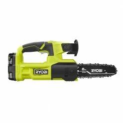 Make yard work easier with this Ryobi 18V One+ Chainsaw. Perfect for pruning, it offers an 8-in. bar and chain. For easy adjustment, it provides side access chain tensioning and on-board tool storage. A lightweight, compact design minimizes fatigue. To ensure simple operation, it works without oil. This chainsaw includes a battery and charger that works with all Ryobi 18V batteries.