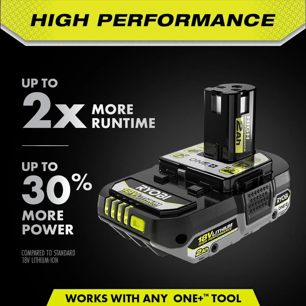 These RYOBI ONE+ 18V Lithium-ion HIGH PERFORMANCE 2Ah batteries provide up to 2X more runtime, 30% more power, and runs cooler compared to our standard lithium-ion batteries to provide long-lasting reliability and better performance in over 225 ONE+ tools. These HIGH PERFORMANCE batteries also feature the most advanced on-board battery electronics that monitor voltage, temperature, and current to extend the life of the battery. When you pair these HIGH PERFORMANCE batteries with any ONE+ HP tool, advanced technology allows them to communicate to provide the best performance possible that powers through heavier applications and protects against overloading and overheating. They perform in extreme weather temperatures and are engineered to be impact resistant. These batteries features integrated LED fuel gauges to check your battery charge at all times. Best of all, they are a part of the RYOBI ONE+ System of over 225 Cordless Tools that all work on the same battery platform. Backed by the RYOBI 3-Year Manufacturer’s Warranty, these batteries include an operator’s manual. Charger sold separately.