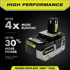 These RYOBI ONE+ 18V Lithium-ion HIGH PERFORMANCE 4Ah batteries provide up to 4X more runtime, 30% more power, and runs cooler compared to our standard lithium-ion batteries to provide long-lasting reliability and better performance in over 225 ONE+ tools. These HIGH PERFORMANCE batteries also feature the most advanced on-board battery electronics that monitor voltage, temperature, and current to extend the life of the battery. When you pair these HIGH PERFORMANCE batteries with any ONE+ HP tool, advanced technology allows them to communicate to provide the best performance possible that powers through heavier applications and protects against overloading and overheating. They perform in extreme weather temperatures and are engineered to be impact resistant. These batteries features integrated LED fuel gauges to check your battery charge at all times. Best of all, they are a part of the RYOBI ONE+ System of over 225 Cordless Tools that all work on the same battery platform. Backed by the RYOBI 3-Year Manufacturer’s Warranty, these batteries include an operator’s manual. Charger sold separately.