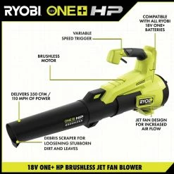 The RYOBI 18V ONE+ HP Jet Fan Blower is the perfect tool for fall cleanup. Simply insert the 18V battery and pull the trigger to start. The premium HP brushless motor provides more power, longer runtime, and a longer motor life. This blower is ideal for light to medium duty use like blowing leaves and light debris. The lightweight design is perfect for users who need a powerful, lightweight option. This handheld blower features a variable speed trigger for more control while cleaning around the home. The jet fan design increases airflow by delivering 350 CFM and 110 MPH of clearing power, allowing for a quick and easy clean up. This blower is also equipped with a 4.0 Ah battery and charger that are compatible with over 260 RYOBI 18V products. This tool is back by a 3-Year Limited Warranty.