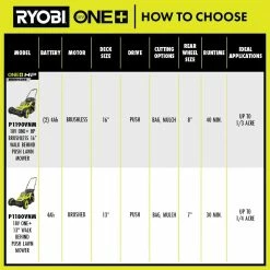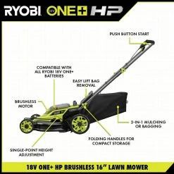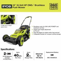 The 16 in. RYOBI 18V ONE+ HP Brushless Mower easily starts with the push of a button and mows up to 40-minutes or 1/3 acre or less with both included batteries. The premium HP brushless motor provides more power, longer runtime, and a longer motor life. Simply insert the included battery and you’re ready to mow in-seconds without the hassle of gas or oil. This mower includes convenient features like a single point height adjustment, 2-in-1 mulching and bagging functions, and easy lift bag removal. The compact, lightweight design makes it easy to carry from one place to another, and the handles fold for convenient, vertical storage when the job is done. This mower is also equipped with (2) 4.0 Ah batteries and charger that are compatible with over 260 RYOBI 18V products. This tool is backed by a 3-Year Limited Warranty.